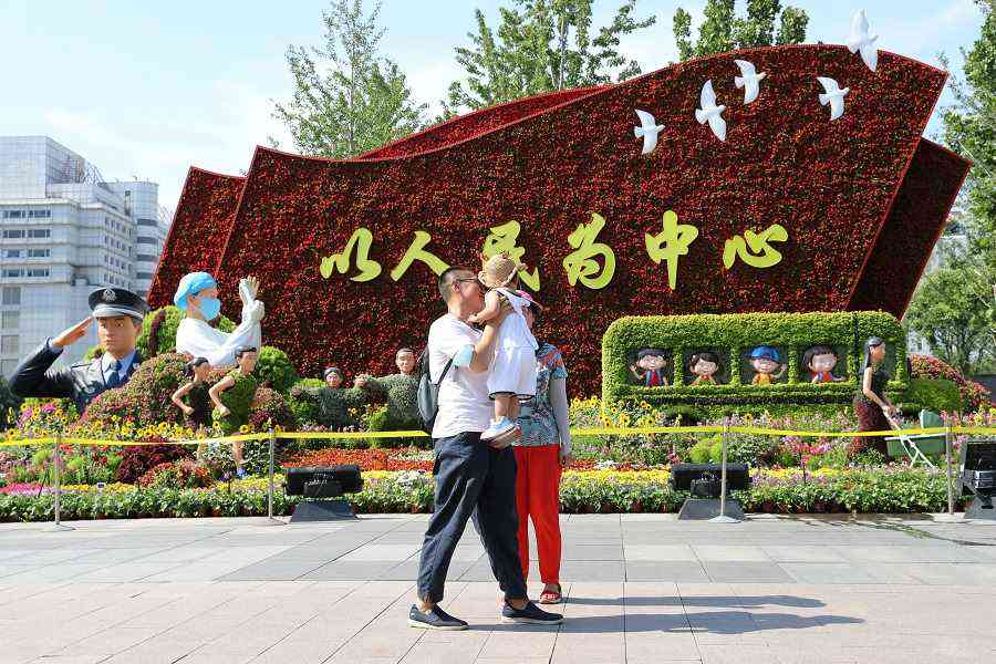 6月22日,市民拍攝西單東南角以“全面小康”為主題的立體花壇。中國日報記者 王壯飛 攝