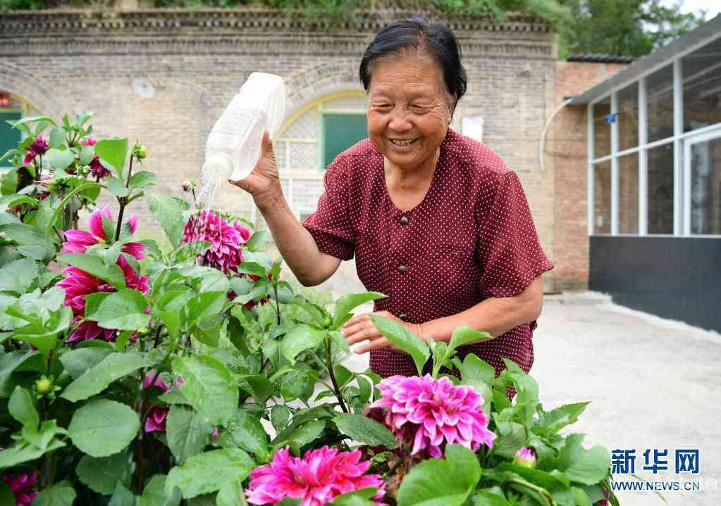 侯秀珍在位于延安市寶塔區(qū)南泥灣村的家中澆花(2017年9月14日攝)。新華社記者 邵瑞 攝