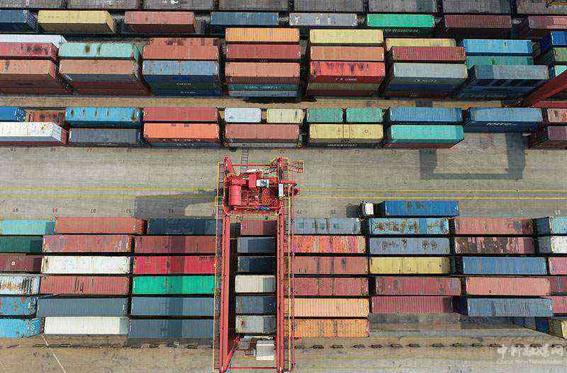 7月9日,在位于江蘇連云港的中哈(連云港)物流合作基地,大型機(jī)械在卸載集裝箱(無人機(jī)照片)。