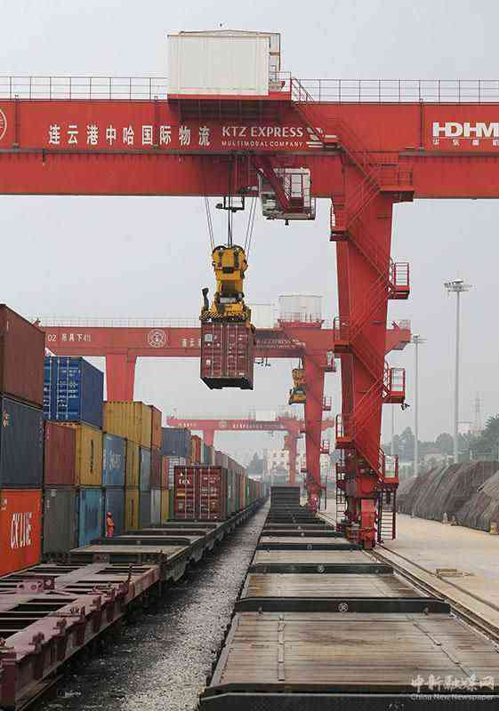 7月9日,在位于江蘇連云港的中哈(連云港)物流合作基地,大型機(jī)械在卸載集裝箱。