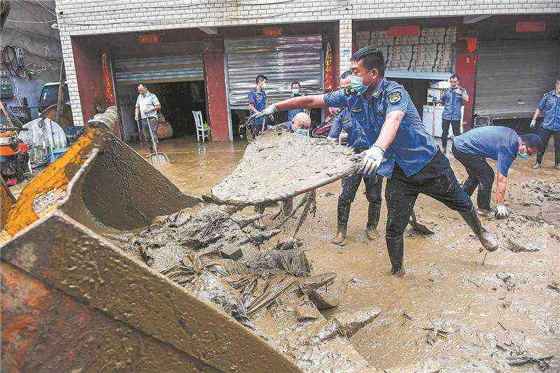 鏟車、裝載機、渣土車、清掃車開進街道,環(huán)衛(wèi)工、青年團員、民兵、志愿者,蹚著泥濘走進居民家里。居民盡己所能,清淤除泥。