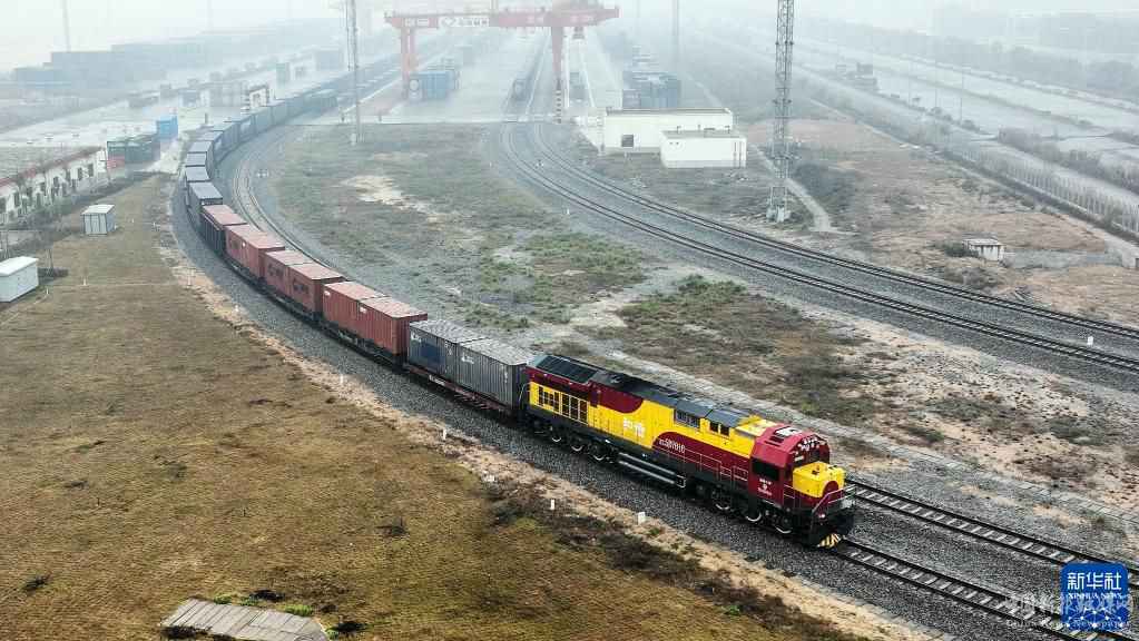 1月15日,廣西新年首趟西部陸海新通道年貨班列從欽州港東站駛出(無人機(jī)照片)。