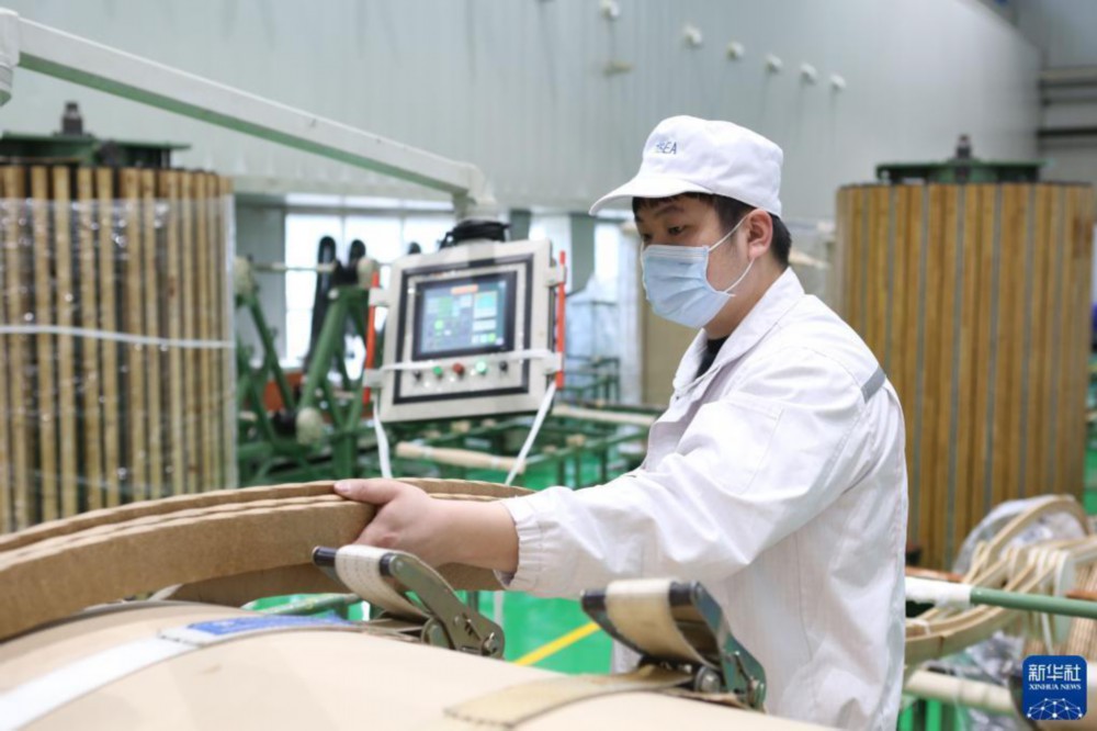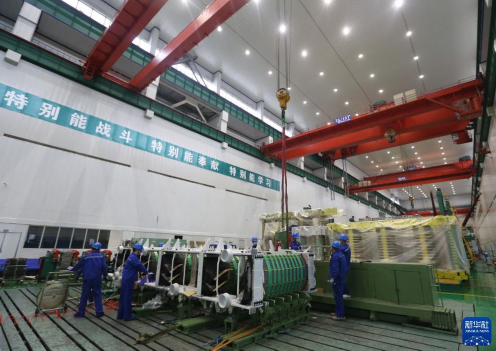3月27日,在位于遼寧省沈陽(yáng)市鐵西區(qū)的特變電工沈陽(yáng)變壓器集團(tuán)有限公司,工人在生產(chǎn)白鶴灘-浙江特高壓直流輸電工程產(chǎn)品。
