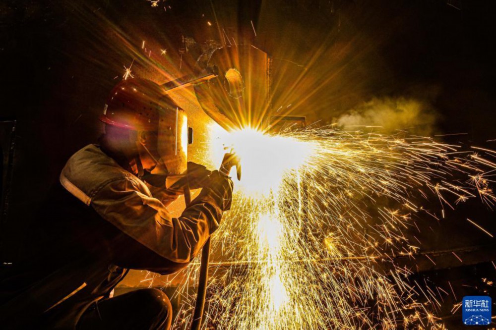 3月24日,在位于遼寧省沈陽(yáng)市鐵西區(qū)的方大集團(tuán)沈陽(yáng)北方重工有限公司,工人在車(chē)間焊接產(chǎn)品。