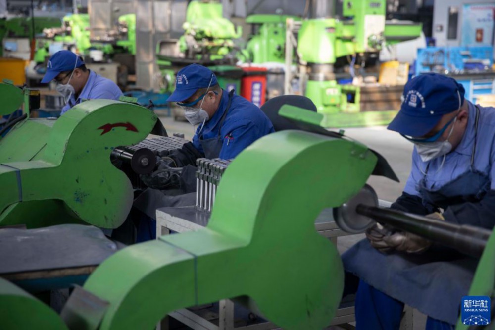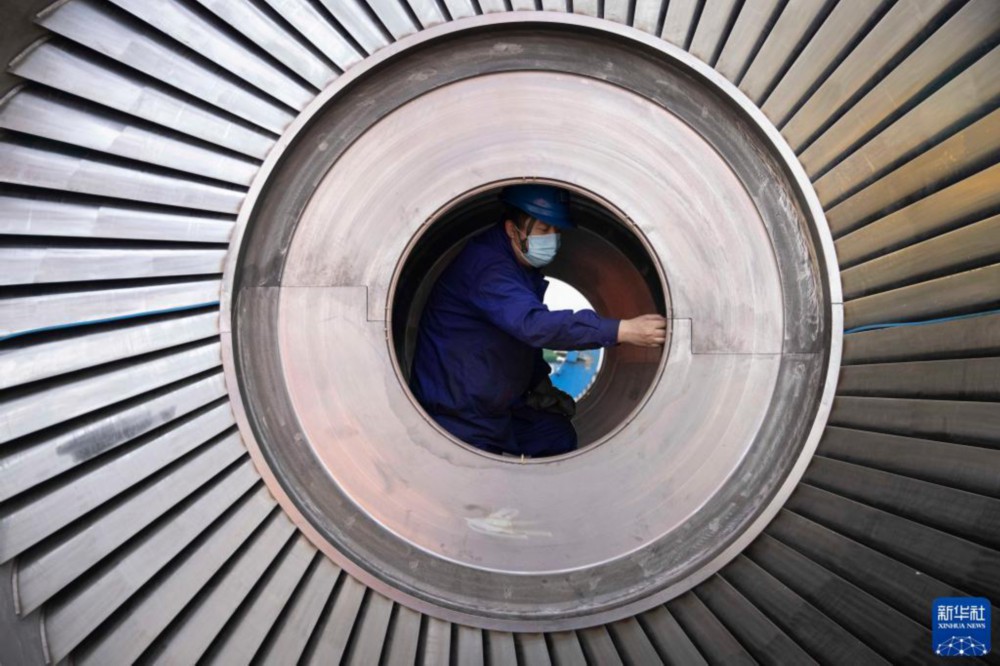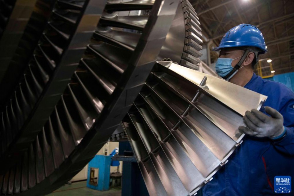 3月28日,工人在哈電集團(tuán)哈爾濱汽輪機(jī)廠有限責(zé)任公司生產(chǎn)車(chē)間作業(yè)。