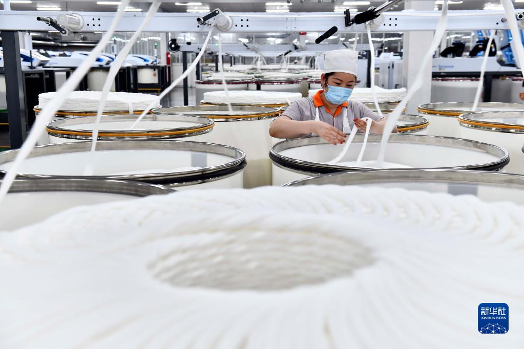 6月26日,山東正凱新材料股份有限公司工作人員在加工高端紗線。