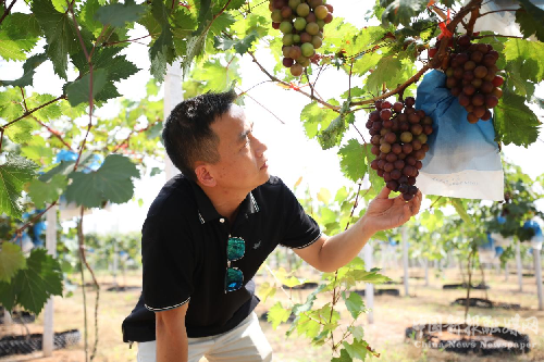 皇田村黨總支書記王偉在察看葡萄生長(zhǎng)情況。