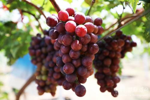 記者在三拓農(nóng)業(yè)產(chǎn)業(yè)園葡萄基地里看到,一條條藤蔓上掛滿了玲瓏剔透的葡萄,在陽(yáng)光的照射下宛如一顆顆會(huì)發(fā)光的珠子。濃郁的果香撲鼻而來(lái),葡萄架下,果農(nóng)們正忙著將成熟的葡萄采摘裝筐。種植管理員莫從格正在采收一串串成熟的“皇田”葡萄,“今年首次掛果,預(yù)計(jì)畝產(chǎn)葡萄1000斤以上,這批葡萄以每斤20元的價(jià)格出售。”莫從格滲著汗珠的臉上,露出豐收的喜悅。他告訴記者,“金香一號(hào)”是繼“陽(yáng)光玫瑰”后的又一個(gè)有發(fā)展前途的好品種。這種葡萄果粒碩大,果肉細(xì)致緊實(shí),含糖量高。而“紅玫瑰”外觀呈現(xiàn)紫紅色,顆粒比較重,看上去像是一串串紅色的寶石一樣,吃起來(lái)味道香甜,感覺有一絲絲的玫瑰香味。