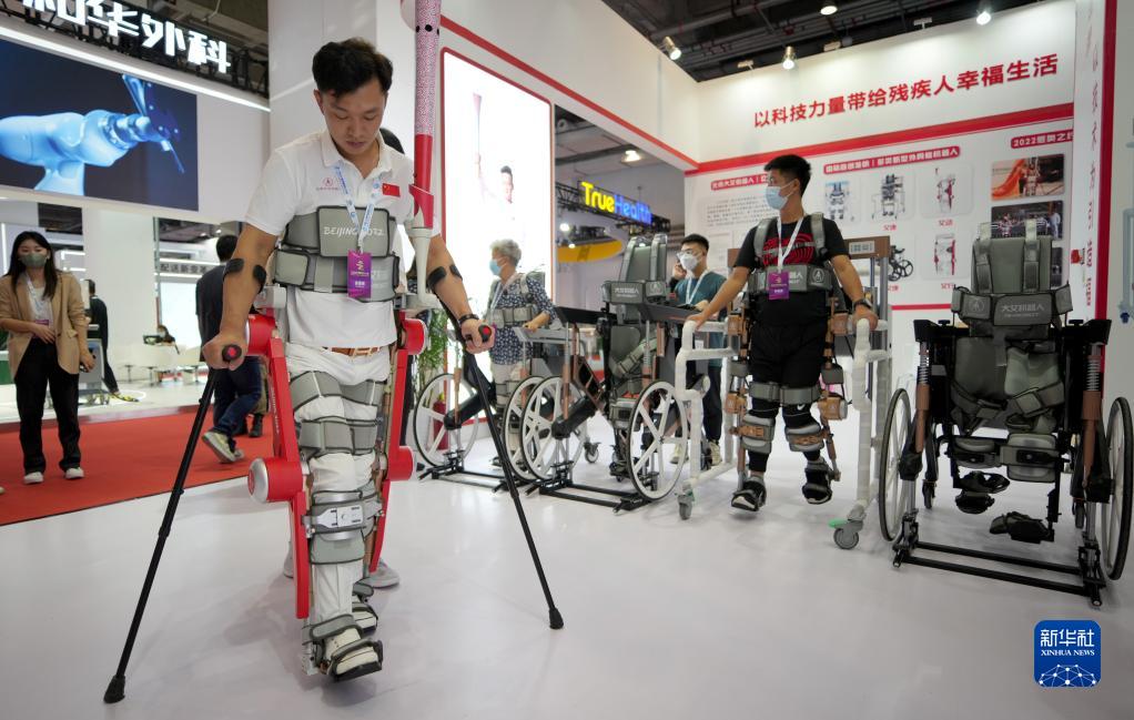 8月18日,參展商在試用下肢外骨骼康復(fù)訓(xùn)練機(jī)器人。新華社記者 王毓國 攝