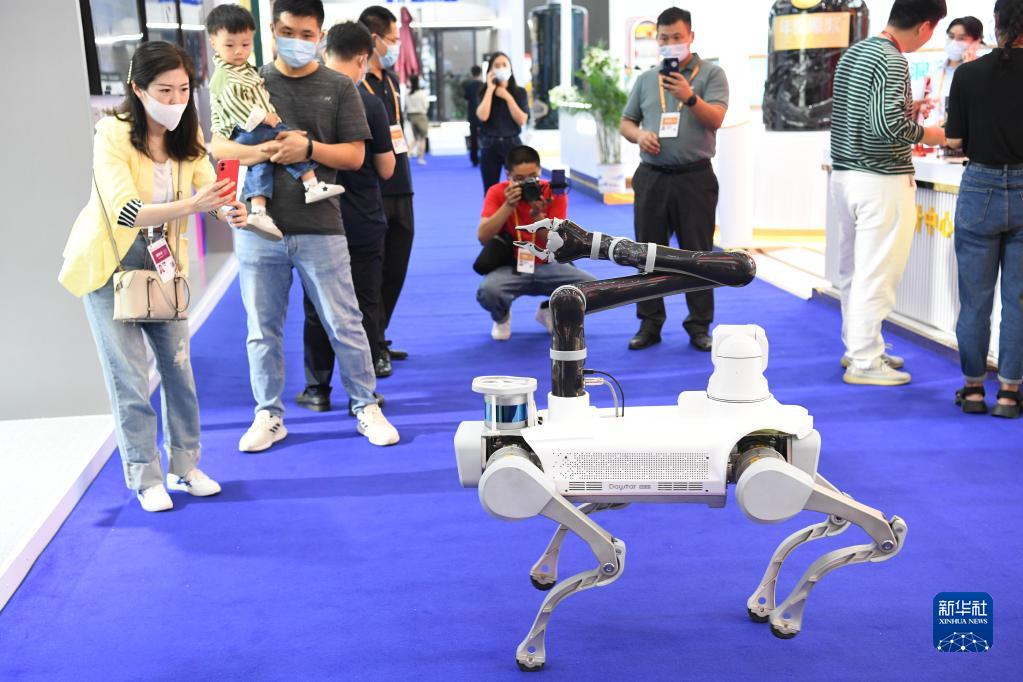 參觀者在安徽合肥舉辦的2022世界制造業(yè)大會(huì)上拍攝展出的一款四足巡檢機(jī)器人(9月20日攝)。