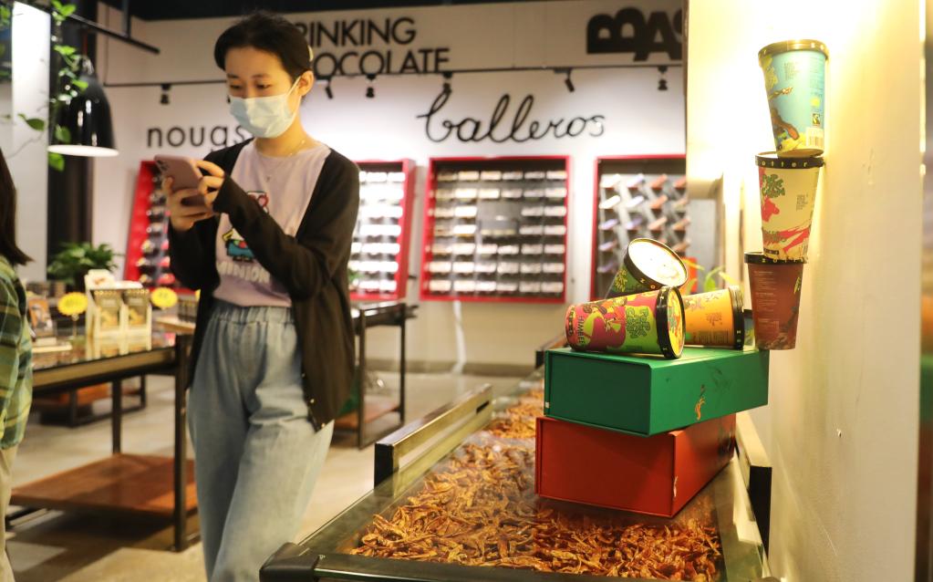 游客走在位于上海楊浦濱江的奧地利珍得巧克力劇院商店內(nèi)(2022年9月24日攝)。在即將開幕的第五屆進(jìn)博會上,珍得巧克力除了擴大展位面積外,也將為中國市場帶來更多全新口味的巧克力。新華社記者 方喆 攝
