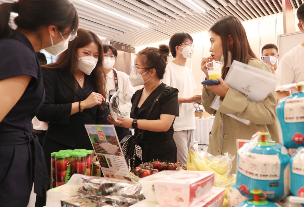 第五屆進(jìn)博會食品及農(nóng)產(chǎn)品展區(qū)、醫(yī)療器械及醫(yī)藥保健展區(qū)展前供需對接會在國家會展中心(上海)舉行。這是對接會嘉賓在參展企業(yè)展位前品嘗水果(2022年8月30日攝)。新華社記者 方喆 攝
