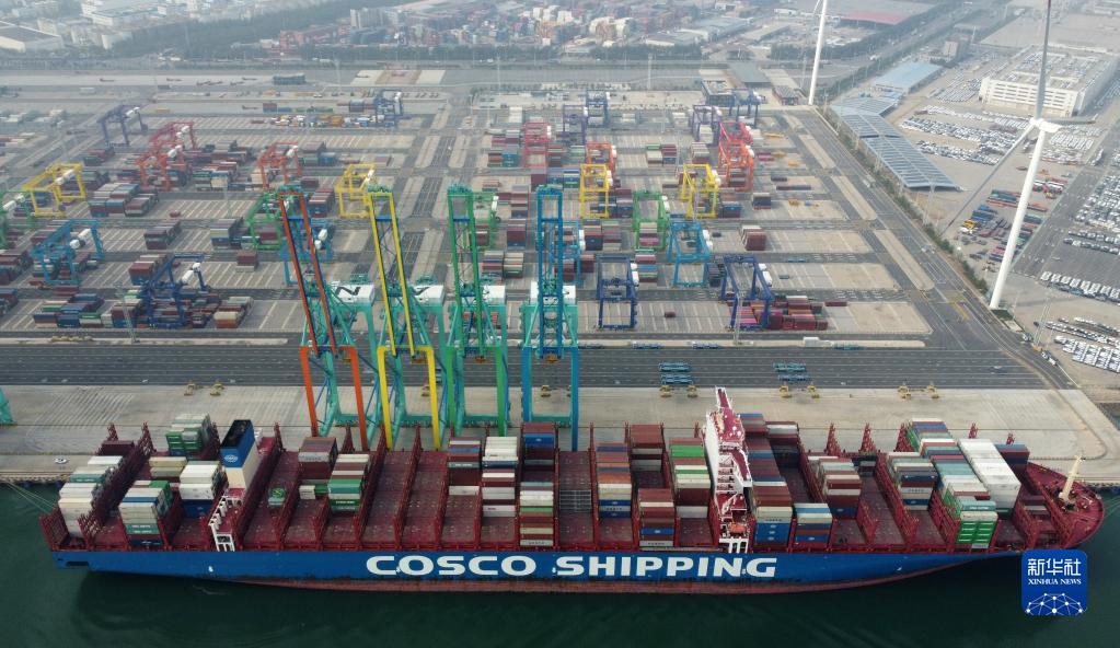 10月13日,“中遠(yuǎn)海運(yùn)天秤座”貨輪??吭谔旖蚋郾苯蹍^(qū)C段智能化集裝箱碼頭進(jìn)行裝卸作業(yè)(無(wú)人機(jī)照片)。 新華社記者 趙子碩 攝
