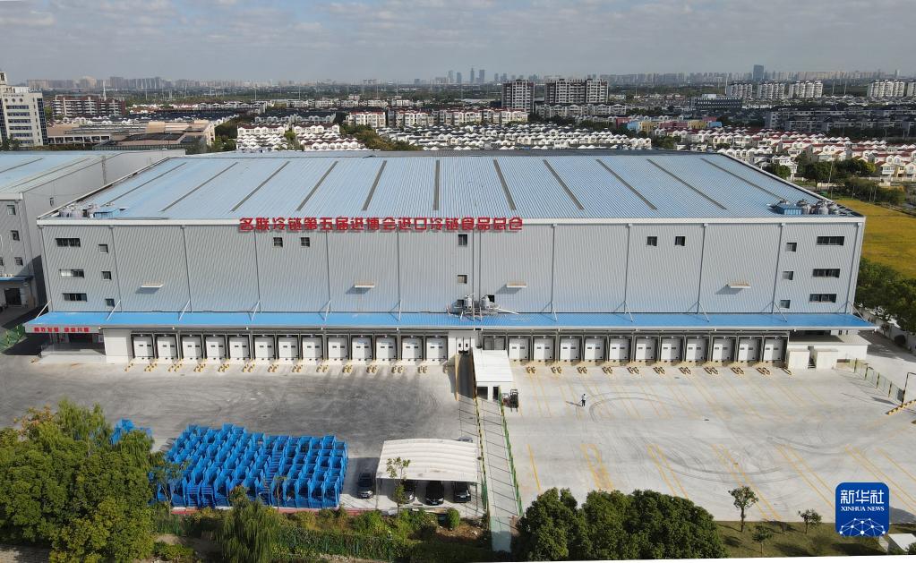 10月20日,空中俯瞰位于上海青浦區(qū)的名聯(lián)冷鏈第五屆進(jìn)博會進(jìn)口冷鏈?zhǔn)称房倐}(無人機照片)。