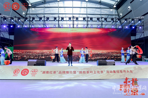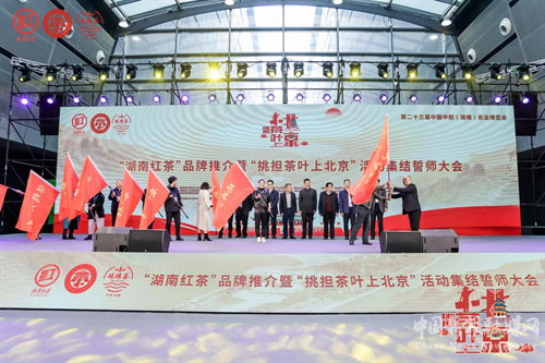 大會(huì)上還舉行了“挑擔(dān)茶葉上北京”誓師儀式,活動(dòng)總冠名碣灘茶品牌,特別支持品牌湖南紅茶、安化黑茶,支持品牌保靖黃金茶、桑植白茶、張家界莓茶、常寧塔山紅、韶山紅、新化紅茶的品牌企業(yè)代表在主辦單位領(lǐng)導(dǎo)的見證下集結(jié),由省領(lǐng)導(dǎo)為承辦單位代表授旗,“挑擔(dān)茶葉上北京”圓滿集結(jié)誓師。