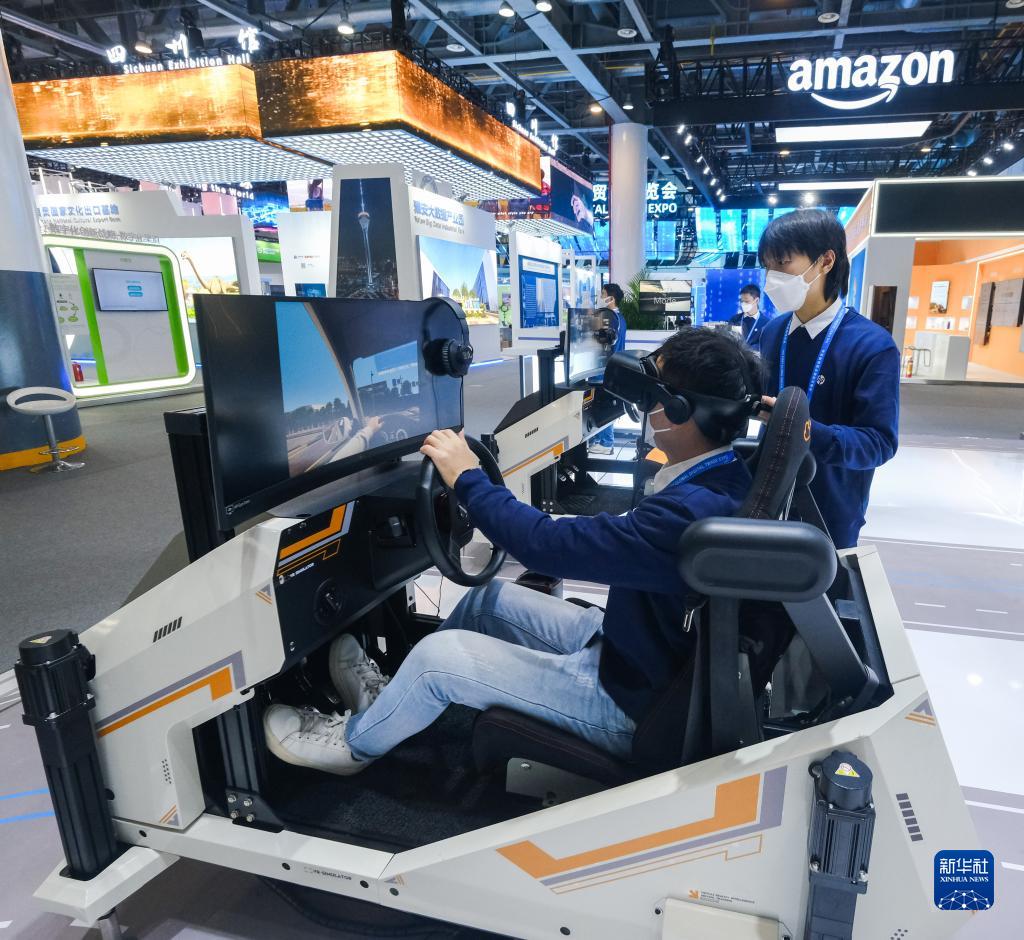 12月11日,在首屆全球數(shù)字貿(mào)易博覽會(huì)現(xiàn)場,工作人員在展示虛擬駕駛系統(tǒng)。