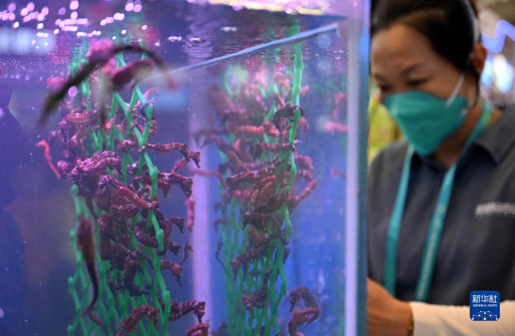 12月15日,觀眾在參觀海南文昌展臺展示的養(yǎng)殖海馬。