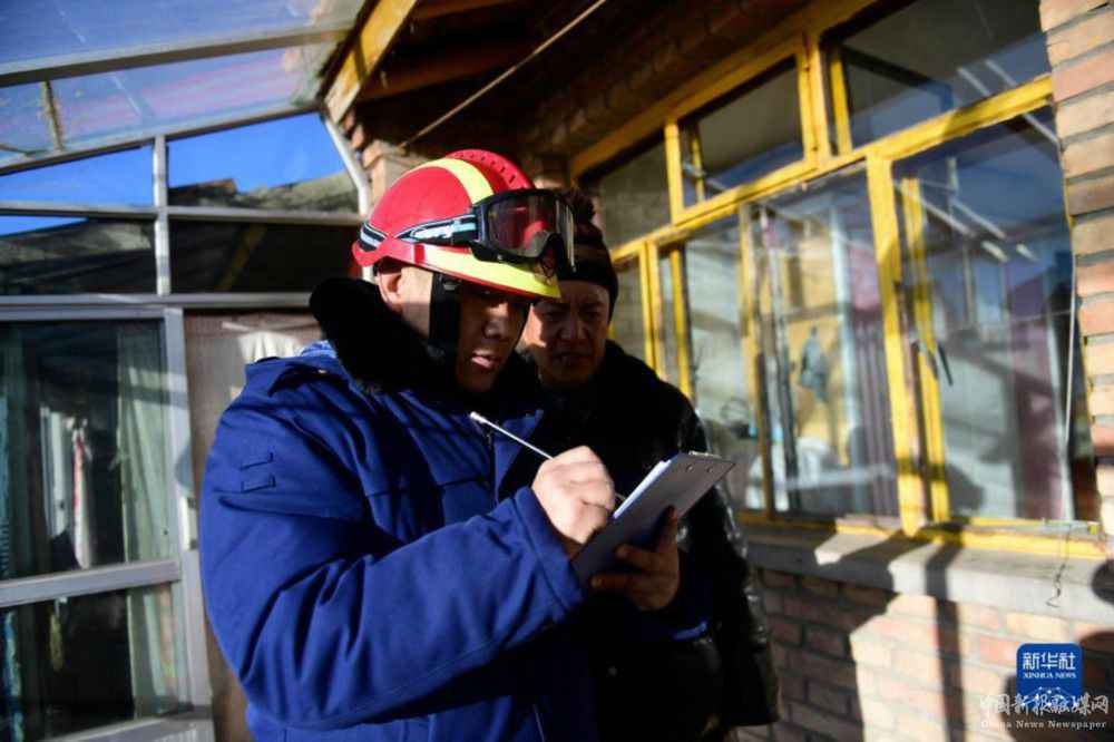 1月8日,在青海省海北藏族自治州門源回族自治縣皇城蒙古族鄉(xiāng)西灘村,海北州消防救援支隊隊員在入戶排查。