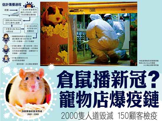本港或出現(xiàn)全球首宗倉鼠傳染新冠肺炎病毒予人類的個案!銅鑼灣寵物店“Little Boss”一名23歲女店員早前確診Delta變種病毒,政府追查發(fā)現(xiàn),女患者曾招待的一名女顧客、女顧客的丈夫相繼中招,該店的倉鼠和大埔倉庫環(huán)境樣本,均發(fā)現(xiàn)對新冠病毒檢測呈陽性反應(yīng)。漁農(nóng)自然護理署表示,雖然暫無文獻顯示倉鼠可把病毒傳人,但染疫后的倉鼠會“不停排毒”,有機會再傳染予人。