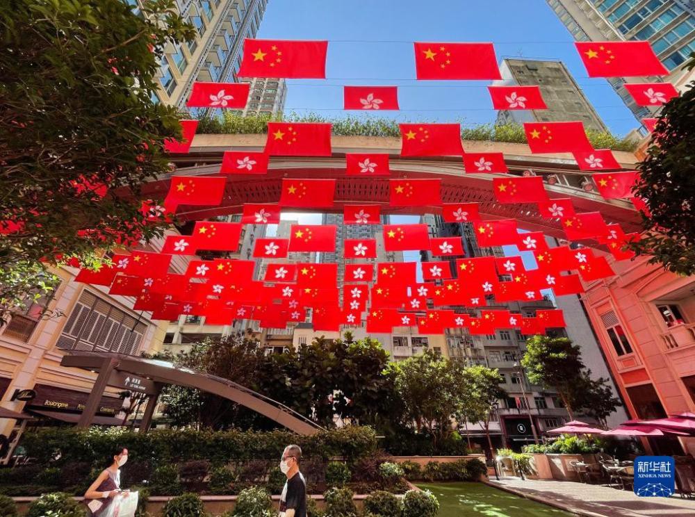 6月29日在香港街頭拍攝的五星紅旗和紫荊花區(qū)旗。香港回歸祖國25周年紀(jì)念日臨近,連日來,香港街頭洋溢著喜慶氛圍。 新華社記者 盧炳輝 攝