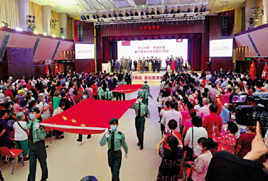 圖:“同心共融.再開(kāi)新篇”慶祝香港回歸祖國(guó)25周年活動(dòng),香港青少年軍總會(huì)的團(tuán)員舉國(guó)旗、區(qū)旗,踏中式步操進(jìn)場(chǎng)。