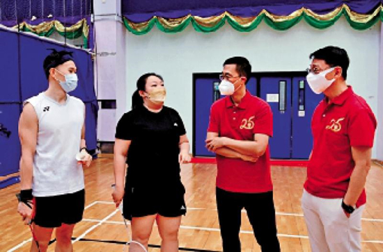 圖:文化體育及旅游局局長(zhǎng)楊潤(rùn)雄(右二)在將軍澳體育館與市民傾談,了解他們對(duì)訂場(chǎng)及使用場(chǎng)地的意見(jiàn)。