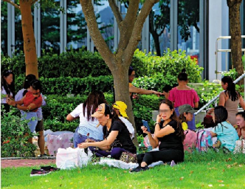 圖:紅磡海濱花園許多外傭如常聚集,部分人士未正確佩戴口罩。\中通社