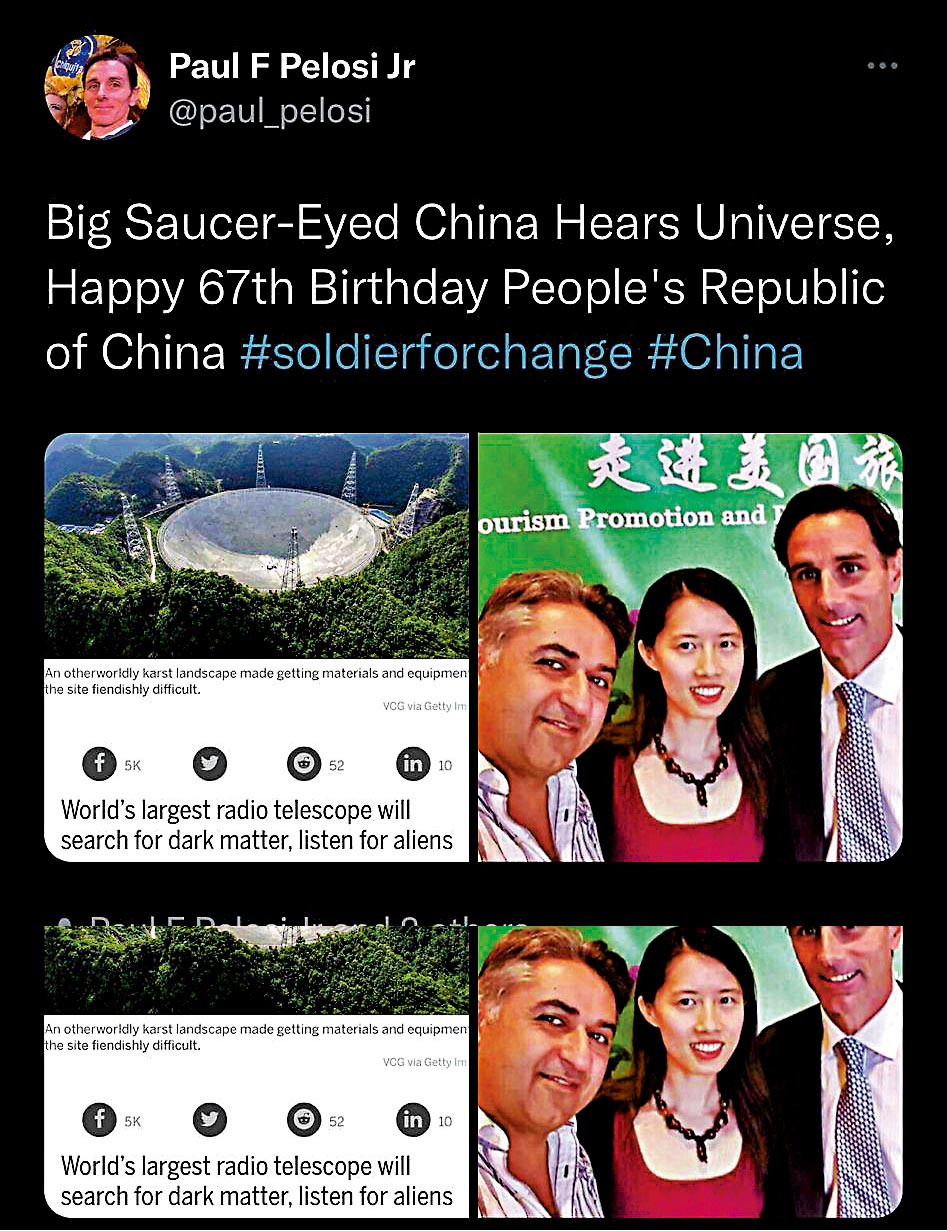 佩洛西多年反中,但小保羅則多年靠內地市場揾真銀,他的個人推特在2016年9月30日,上帖“中國天眼”之稱的500米口徑球面無線電望遠鏡,小保羅還寫上“祝賀中華人民共和國67周年國慶”。
