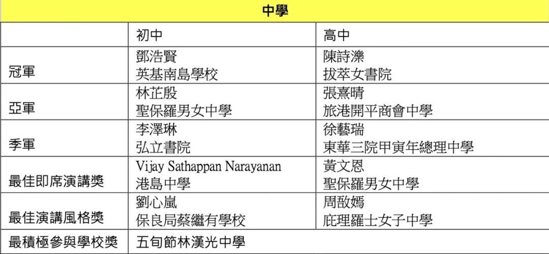 活動(dòng)上,大會(huì)頒發(fā)了決賽入圍獎(jiǎng)、最積極參與學(xué)校獎(jiǎng)、最佳即席演講獎(jiǎng)、最佳演講風(fēng)格獎(jiǎng)、以及冠、亞、及季軍等獎(jiǎng)項(xiàng)。今屆賽事適逢香港回歸25周年,香港賽區(qū)將派出12名選手代表香港參加10月上旬舉辦的全國總決賽,與來自全國100多個(gè)賽區(qū)的逾千名選手同臺(tái)競(jìng)技,交流學(xué)習(xí),展現(xiàn)香港學(xué)生的風(fēng)采。