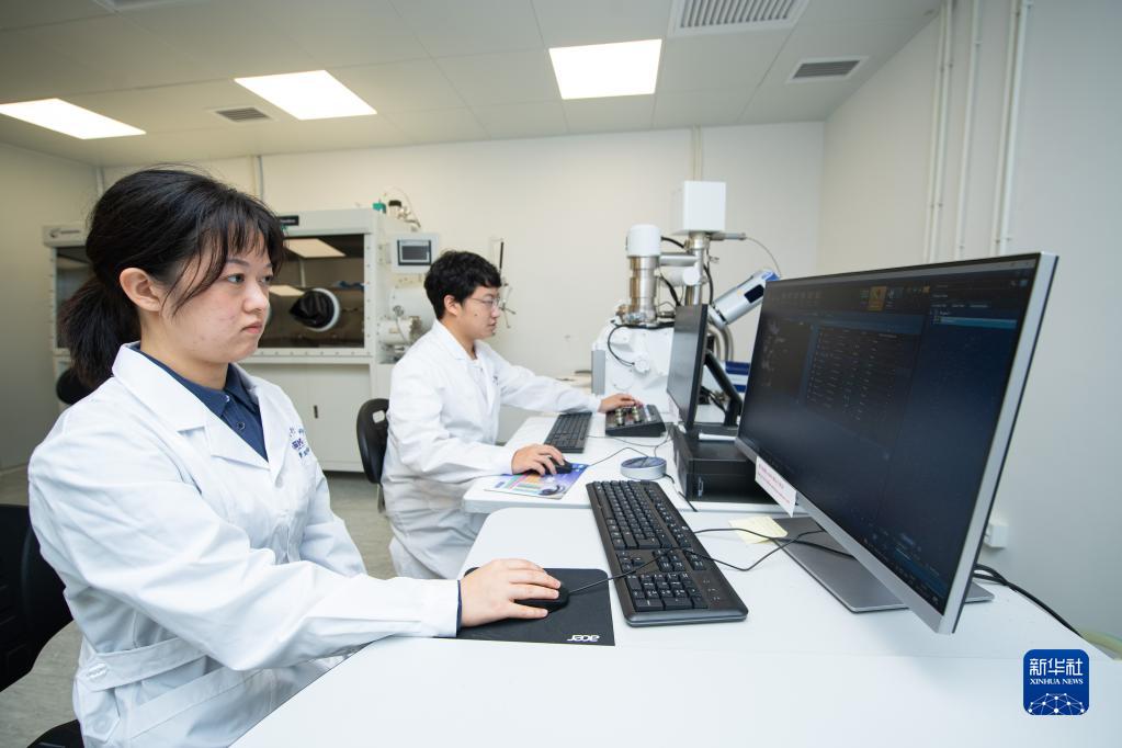 10月6日,“95后”的澳門科技大學(xué)月球與行星科學(xué)國家重點(diǎn)實(shí)驗(yàn)室博士生羅希子(前)、劉子博在實(shí)驗(yàn)室工作。新華社記者 張金加 攝