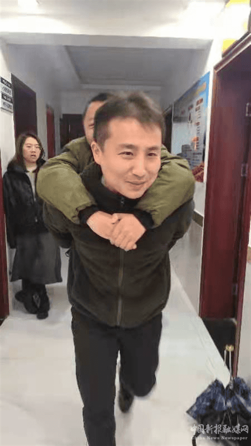 廖紅領(lǐng)到慰問金和物資后,長沙市開福區(qū)清水塘街道政協(xié)聯(lián)絡(luò)處主任陳陽看到廖紅行動不便,背著廖紅下樓并貼心將他送上車。