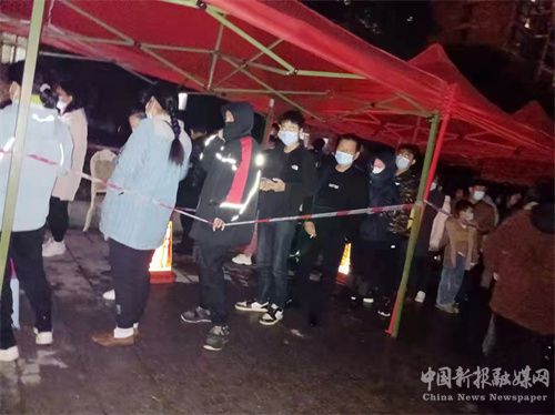 晚上七點,全民核酸檢測正式開始。在短短的二小時內(nèi),數(shù)千人有序地排成了兩條長龍。一處分為兩隊,分別十人一組,兩邊同時進行檢測?,F(xiàn)場一片寂靜,鴉雀無聲,檢測完畢的居民,均從另一側,有序地離開。