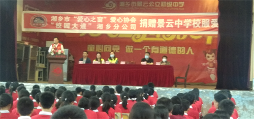 在捐贈儀式上,作為主辦方的福建“校園大道”湘鄉(xiāng)分公司負(fù)責(zé)人周青芳女士向景云中學(xué)的300名孩子每人捐贈一件紅色的短袖校服和50件籃球服。湘鄉(xiāng)市委宣傳部副部長賀文春作了熱情洋溢的講話,他以“強(qiáng)國有我”和“志愿服務(wù)有我”為主題,借用周青芳女士創(chuàng)業(yè)和湘鄉(xiāng)市“愛心之窗”愛心協(xié)會18年發(fā)展歷程的故事,勉勵(lì)獲得資助的學(xué)生能夠胸懷大志,努力學(xué)習(xí);在將來的生活和工作中能夠懷感恩之心,為建設(shè)社會主義現(xiàn)代化強(qiáng)國貢獻(xiàn)自己的一份力量,同時(shí)也能夠在以后的工作中多從事愛心志愿活動,把志愿精神傳遞下去。