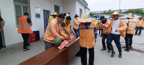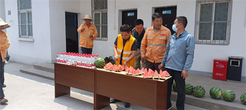 6月3日上午10時30分,烈日當(dāng)頭,天氣酷熱。在中國鐵路上海局集團有限公司阜陽工務(wù)段亳州線路車間三堂集維修工區(qū)院內(nèi),近百名作業(yè)人員手捧西瓜,個個邊吃邊贊“西瓜真甜”、“即解渴又解暑”……而在端午節(jié)深入一線慰問送清涼的阜陽工務(wù)段副段長程勇、線路科副科長彭光榮及亳州線路車間主任胡三軍也是一邊切瓜一邊連連說道:“不要急,大家慢慢吃。”“西瓜、礦泉水都有,大家吃過瓜,再帶瓶水。”“今天端午節(jié),我們來慰問大家,西瓜吃完了再來拿。”……