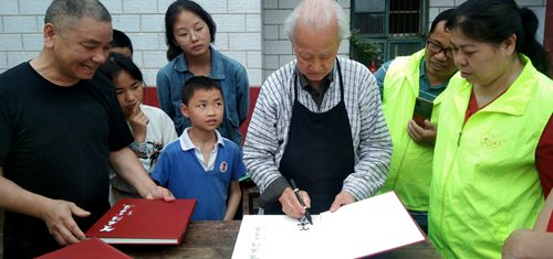 德高望重的書畫家賀安得現(xiàn)場為志愿者簽名贈書