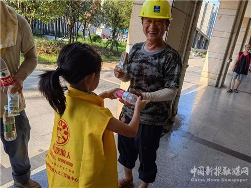 這次參加活動的小朋友中,最小的才4歲,也跟隨哥哥奶姐姐們走在馬路上去送水,雖然天氣炎熱,小小義工們卻樂此不疲,奔走在大街小巷,尋找戶外辛勤工作人員,當(dāng)送出一瓶愛心礦泉水,小朋友們心里是快樂的,滿足的,也深深感受到這些默默堅守在自己崗位上的戶外工作者的不容易。