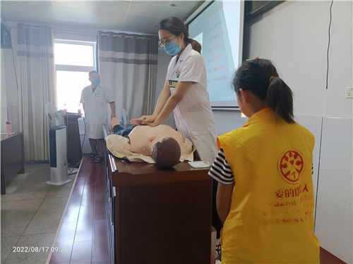 活動現(xiàn)場,果園鎮(zhèn)衛(wèi)生院骨干醫(yī)師周醫(yī)師為大家詳細講解了徒手心肺復蘇的知識(包含防溺水的心肺復蘇知識等)。緊接著,果園鎮(zhèn)衛(wèi)生院住院部主任龍醫(yī)生結合理論知識和實際救護技巧,為大家講解了海姆力克急救法的救護知識,龍醫(yī)生為了使學生更深入了解各項救護技巧,掌握心肺復蘇要領,與孩子們在現(xiàn)場展開了深入互動,對心肺復蘇進行了實操演練,手把手向同學們傳授了急救手法,詳細地講解了急救注意事項,進一步給大家講解了心肺復蘇“一看、二判、三掃視、四呼、五定、六壓胸、七開、八吹、九檢查”等相關操作要領?,F(xiàn)場孩子們學習非常認真,雖然天氣很熱,但報名參加實操的孩子們個個激情高漲,積極舉手報名參與。