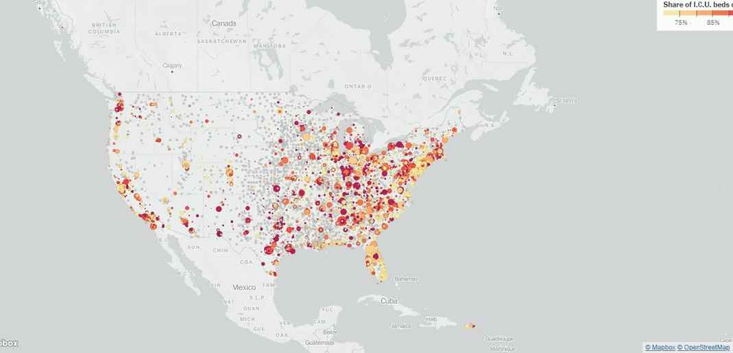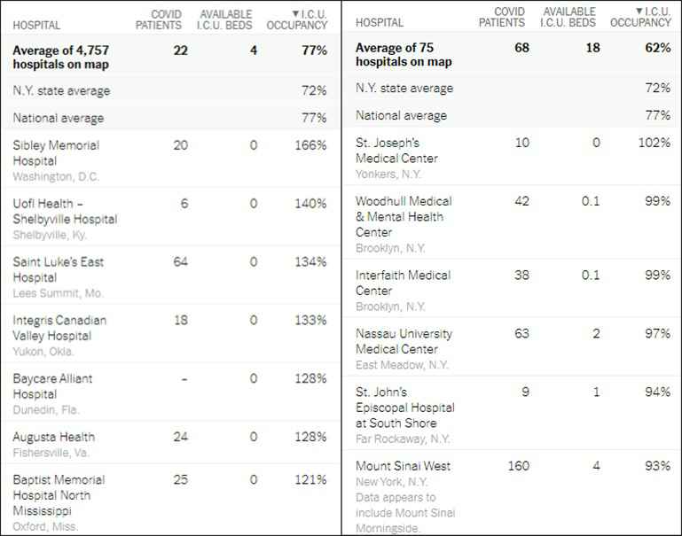 《紐約時報》制作的圖表顯示,ICU超負荷運轉的醫(yī)院在全美超過40家,位于華盛頓特區(qū)的一家醫(yī)院的ICU占用率高達166%。其中,紐約醫(yī)院的ICU占用率達到72%,最高達102%。