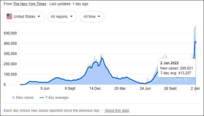 隨著“奧密克戎”在全美肆虐,美國近期單日新增確診激增。根據美國約翰斯·霍普金斯大學統計數據,截至2022年1月4日6時21分,美國新冠肺炎累計確診病例達到55968902例,累計死亡病例達到827312例。在過去約24小時里,美國新增確診病例899555例,新增死亡病例1306例。