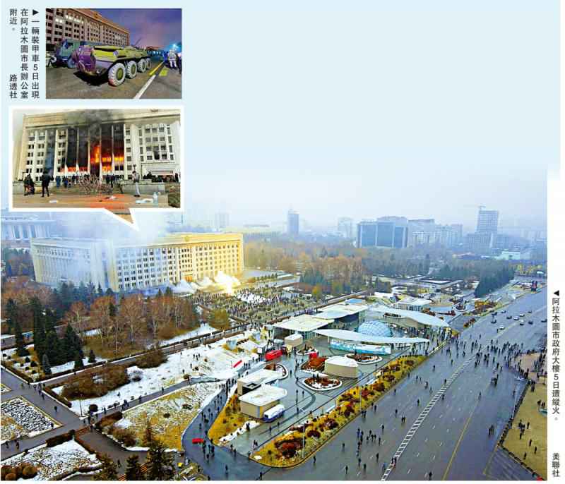 圖:阿拉木圖市政府大樓5日遭縱火。\美聯(lián)社