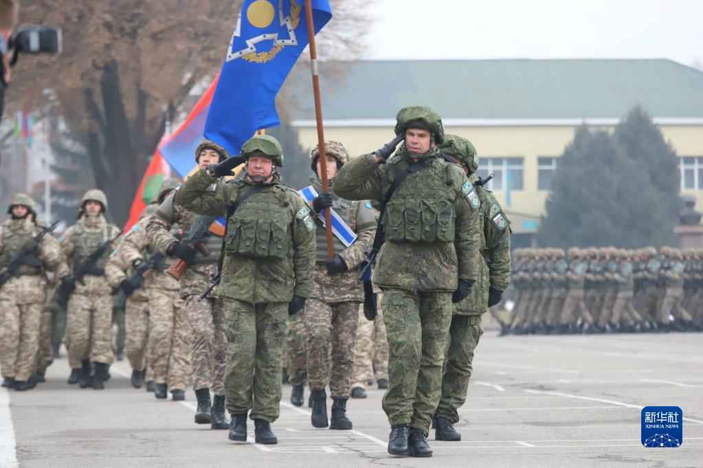 1月13日,在哈薩克斯坦阿拉木圖,集安組織維和部隊(duì)在送行儀式上接受檢閱。新華社發(fā)(阿里汗·薩里耶夫 攝)