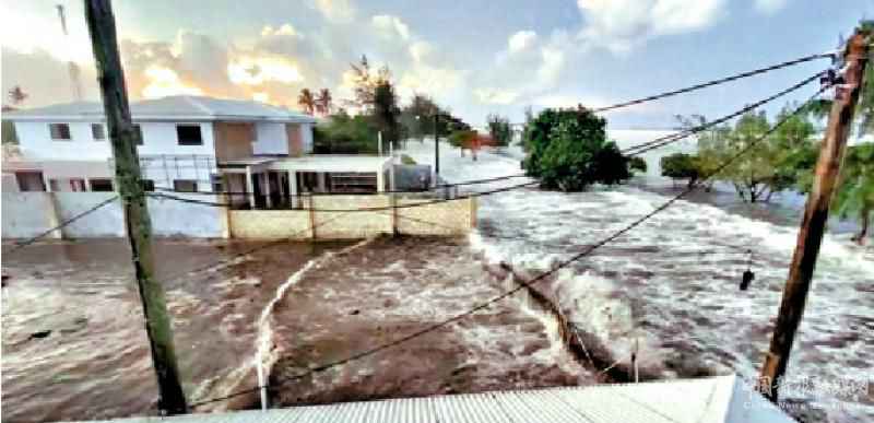圖:湯加14日火山噴發(fā)后,社媒視頻顯示當(dāng)?shù)胤课荼缓K蜎]。\網(wǎng)絡(luò)圖片