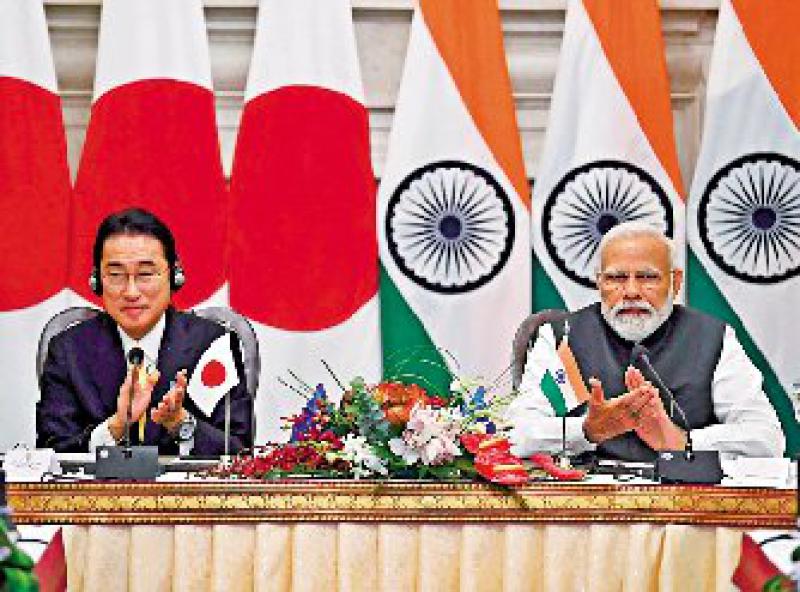 圖:日本首相岸田文雄(左)和印度總理莫迪(右)19日在新德里會談。\法新社