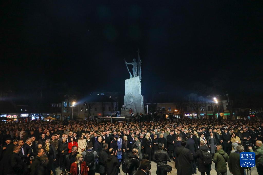 3月24日,在塞爾維亞中部城市克拉列沃,人們?cè)谑兄行牡娜麪柧S亞勇士廣場(chǎng)悼念23年前在北約轟炸中遇難的同胞。新華社記者 石中玉 攝