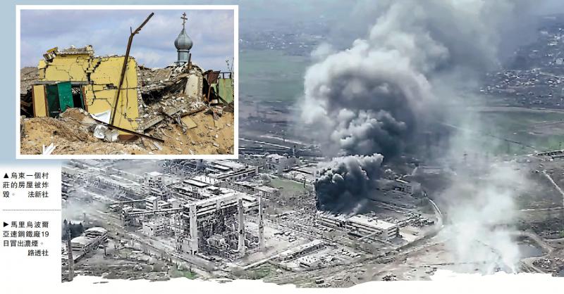 上圖:烏東一個(gè)村莊的房屋被炸毀。\法新社;右圖:馬里烏波爾亞速鋼鐵廠19日冒出濃煙。\路透社
