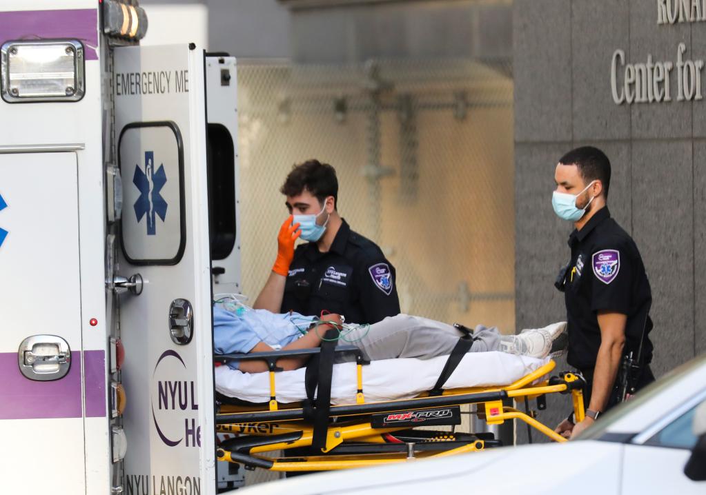 2022年5月17日,醫(yī)護(hù)人員在美國紐約一家醫(yī)院外轉(zhuǎn)運(yùn)病人。(新華社記者王迎攝)