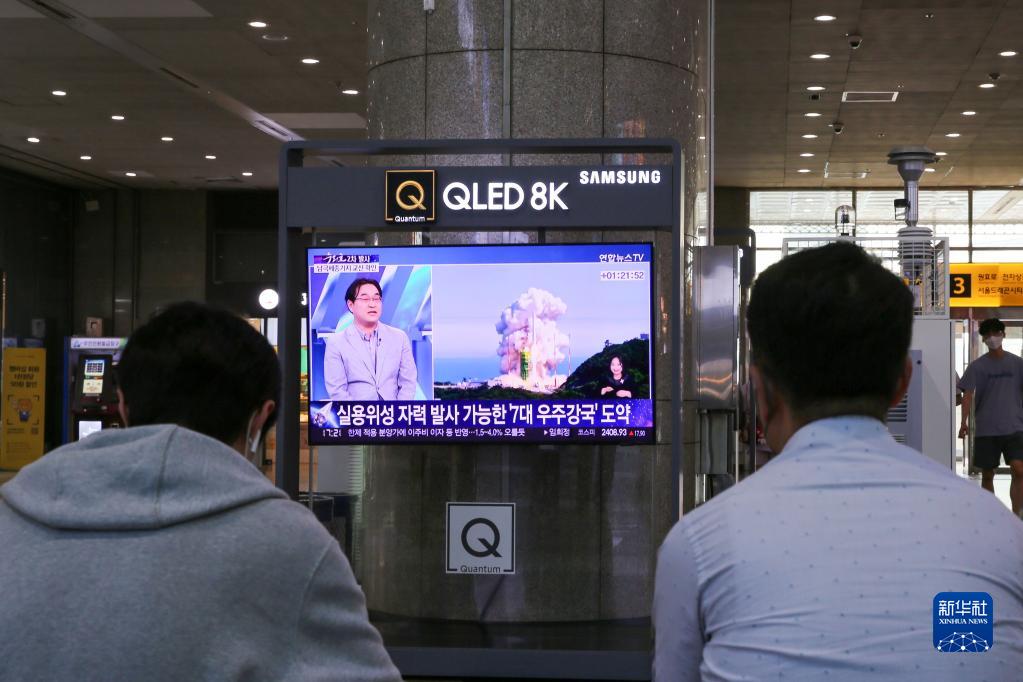 6月21日,人們?cè)陧n國(guó)首爾龍山火車(chē)站通過(guò)電視屏幕觀看“世界號(hào)”運(yùn)載火箭發(fā)射。