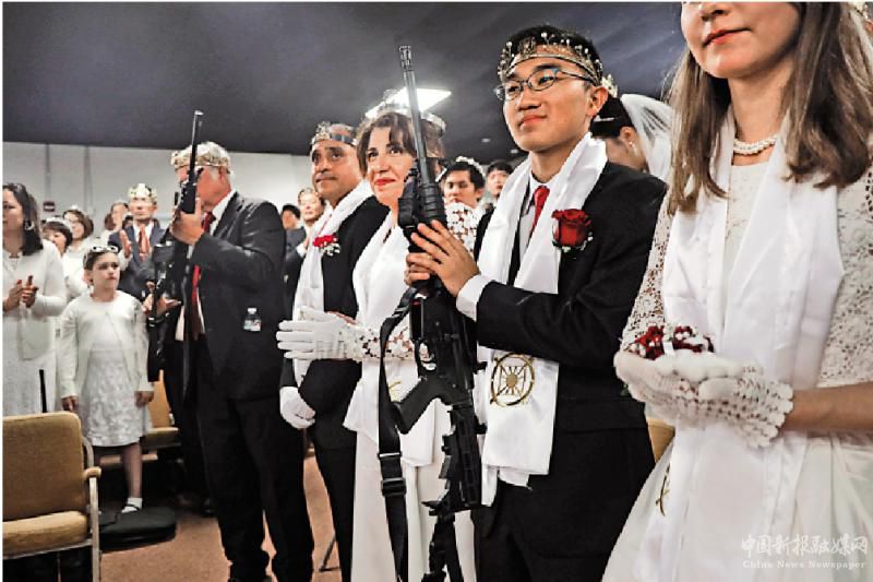 圖:2019年10月,文鮮明之子文亨進(jìn)創(chuàng)辦的“圣所教堂”在賓夕法尼亞州舉辦集體婚禮祝?;顒?dòng),參與者手持AR-15步槍。/法新社