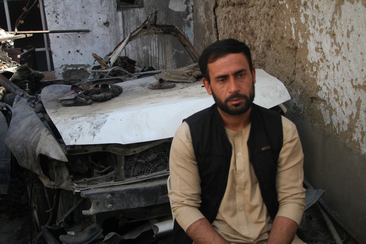 2021年9月18日,在8月29日被美軍無人機(jī)襲擊的阿富汗喀布爾居民區(qū),遇難者扎瑪賴的弟弟哈米迪坐在汽車殘骸前。新華社發(fā)(塞夫拉赫曼·薩菲攝)
