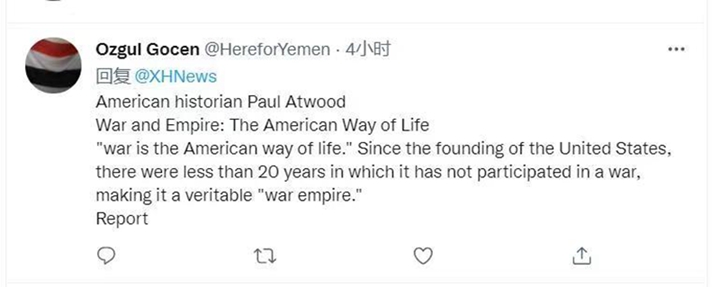 英國網(wǎng)友厄茲居爾·格琴對報告中援引的一段話很有共鳴:美國歷史學(xué)家保羅·阿特伍德在2010年出版的《戰(zhàn)爭與帝國:美國的生活方式》一書中指出,“戰(zhàn)爭是美國人的生活方式。”美國自建國以來,沒有參加戰(zhàn)爭的時間不足20年,是一個名副其實(shí)的“戰(zhàn)爭帝國”。